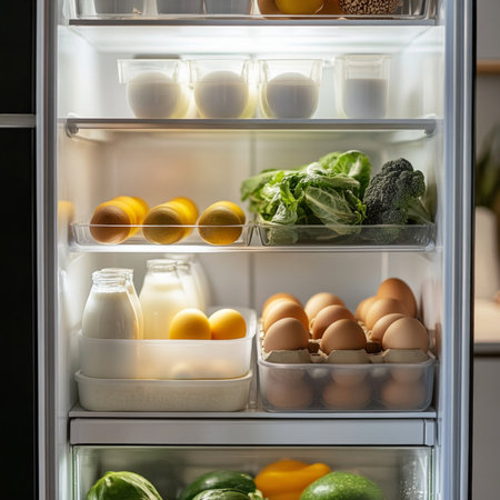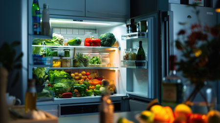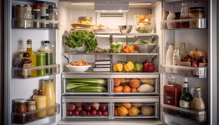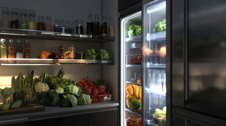 Modern kitchen with smart refrigerator interior displaying organized fresh produce. That the image is generated using AI.