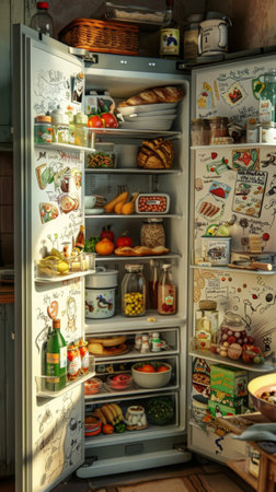The open refrigerator showcases an array of fresh fruits, vegetables, and colorful jars filled with homemade preserves. Artwork adorns the outside, adding charm to the cozy kitchen.