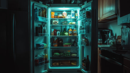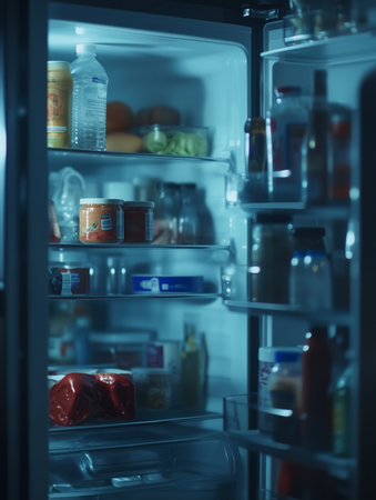 close-up of refrigerator door, featuring illuminated interior light and sleek design, created with generative ai