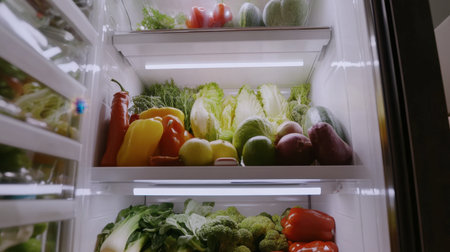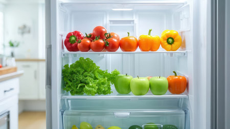 A colorful assortment of fresh vegetables and fruits fills a well-organized refrigerator. Bright greens, juicy reds, and yellow hues create a lively, healthy ambiance inside the appliance.