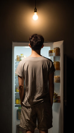 Rear view of a young man looking inside a refrigerator illuminated by a single light bulb at night