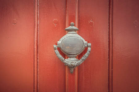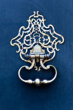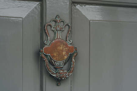 Close up on a historic door knocker on an old wooden door. Typical is the beautiful ornament and the manufacture of iron.