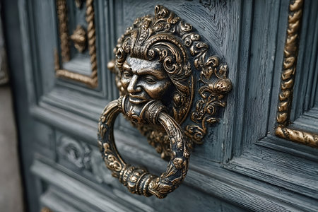 Close up of an ancient, ornate door handle featuring a decorative face and a golden ring, set against a gray wooden door, showcasing intricate craftsmanship and adding a touch of vintage elegance