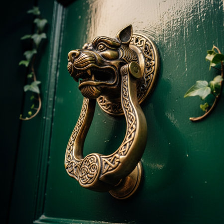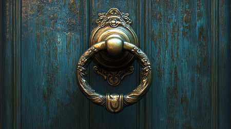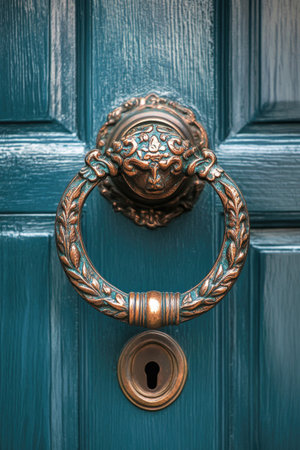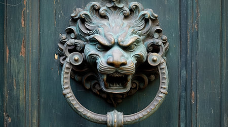 close-up of an ornate bronze door knocker on a green door, created with generative ai