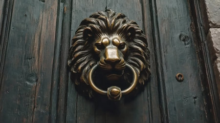This bronze lion door knocker, set against a rustic wooden door, captures the essence of traditional craftsmanship with its intricate design and timeless appeal.