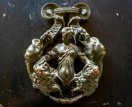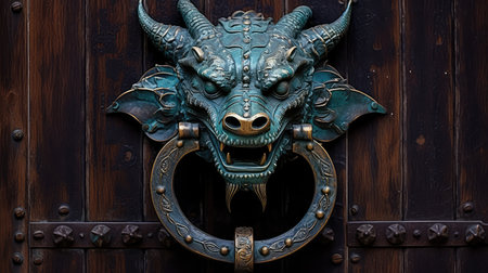 An ornate, weathered door knocker hangs from an old wooden door, showing intricate details and a rich history through its tarnished surface and vibrant textures.