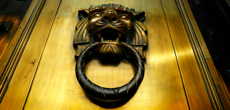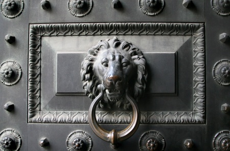 door handle in the form of a lion's head with a ring in its mouth on a metal door.