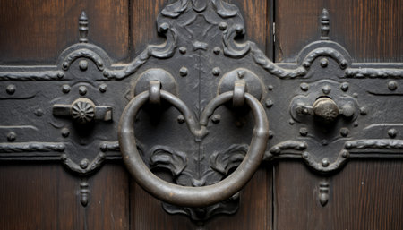 This captivating vintage door knocker features intricate detailing set against a rustic backdrop, highlighting its timeless elegance and rich history.