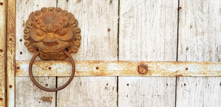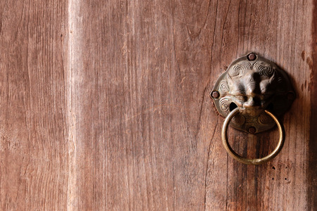 Rusty lion head door knocker decorate on rough wooden door in Chinese style with copy space - Art, Decorated and Classic design object