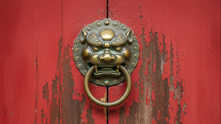 Close-up of a weathered, antique Chinese lion head door knocker with a brass ring, set against a distressed red wooden door.