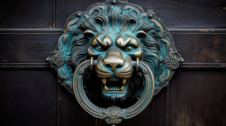 Close-up of a lion head door knocker, showcasing exquisite craftsmanship and adding a touch of luxury to dark wood furniture, with ample copy space for design or text