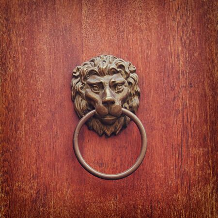 Lion door handle on wooden historic door in Prague, Czech Republic