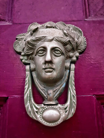 Closeup of metal door knocker made in the shape of a female head on Georgian purple door of an Irish house in Dublin, Ireland.