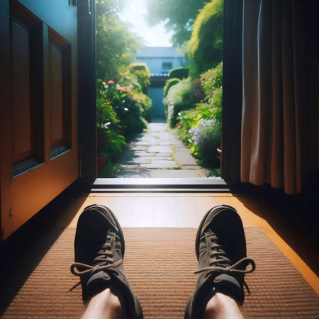 A rear view of a man stepping out through an open door into a sunny garden. The image captures the transition from indoors to outdoors, symbolizing leaving home, freedom, or enjoying a summer day.