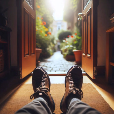 A low-angle shot of a person with a shoulder bag standing in an open doorway, stepping out into the sunlight. The image captures the moment of departure, travel, or starting a new journey from a home interior.