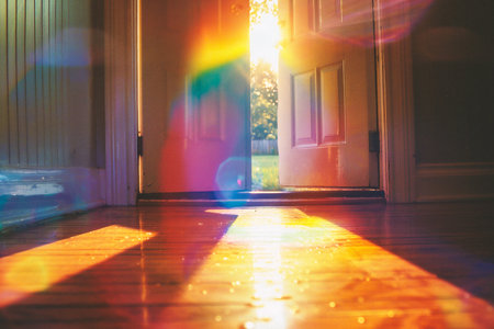 warm light, door, sunset, hallway, illumination, serene atmosphere A door slightly ajar reveals a glowing sunset, casting a golden hue onto the dark wooden floor and creating a peaceful ambiance