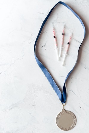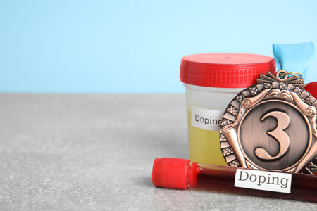 Medal, tube of blood and urine with words Doping on light gray stone background. Space for text