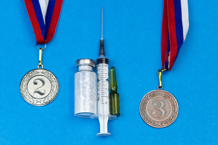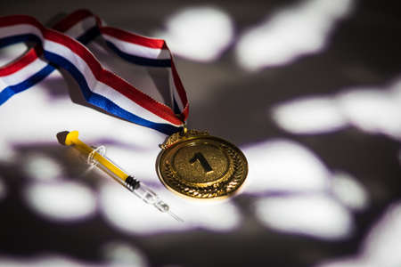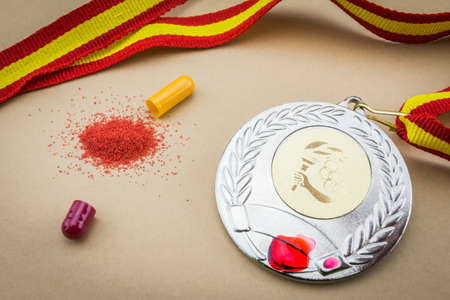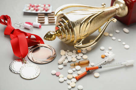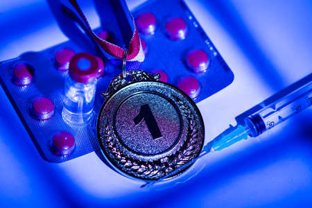 The use of performance-enhancing substances by athletes. The medals won, the syringes and pills used, and the capsules, all depicted against a neutral backdrop. High quality photo