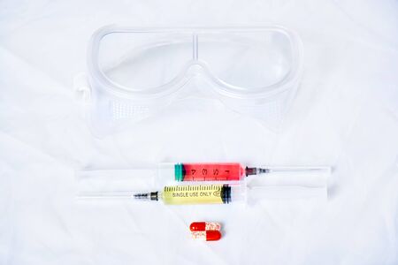 Protection against coronavirus COVID-19, glasses, medical mask, syringes with injection. Flask with red liquid and coronavirus on a white background