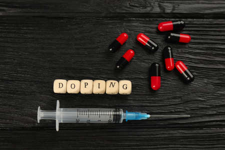 Black cubes with word Doping and drugs on wooden background, flat lay