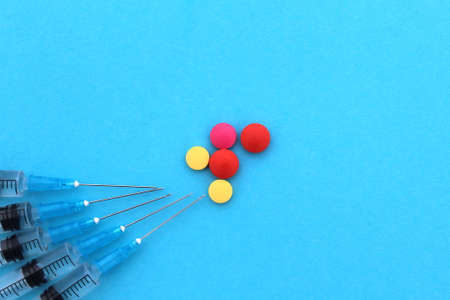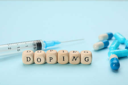 Doping athletes in competitions. Prohibited drugs to increase athletic performance in the competition. Syringe, medicine on a blue background.