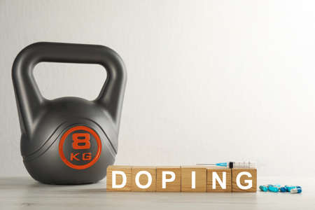 Wooden cubes with word Doping, drugs and kettlebell on table. Space for text