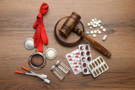 Flat lay composition with drugs on wooden table, space for text. doping control