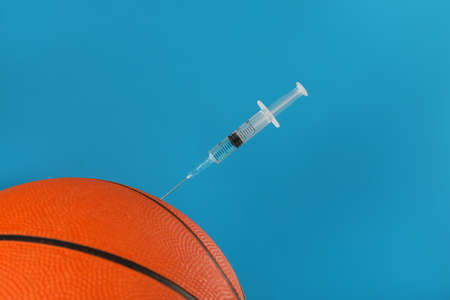 Closeup view of basketball ball with syringe on light blue background, space for text. Doping concept