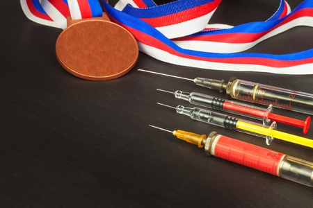 Concept of doping in sport - deprivation medals close up on dark wooden background