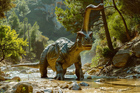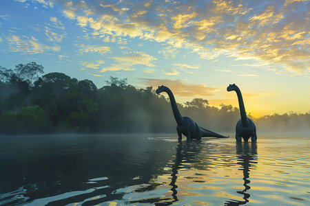 A stunning depiction of a dinosaur in a misty jungle setting, surrounded by lush flora and tranquil waters. This serene scene captures the essence of ancient life on Earth.