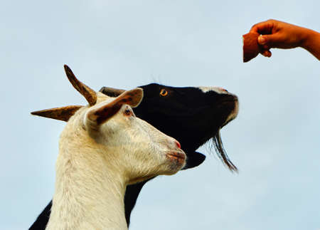 white Saanen goat eat food from tourist
