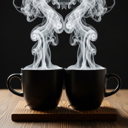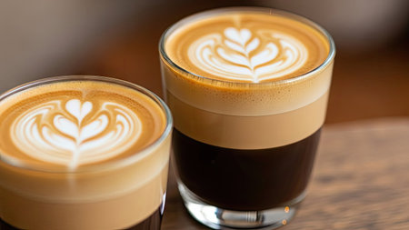 Two cups of cappuccino with latte art on black background