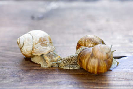 Burgundy snail Helix pomatia or escargot is a species of land snail. Burgundy snail gliding on the ground. Edible escargot. Growing snails. close up