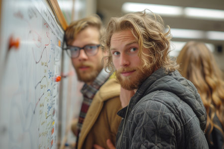 Two male physicists with questioning expressions stand before a whiteboard filled with colorful equations and diagrams in a bright lab. physicist