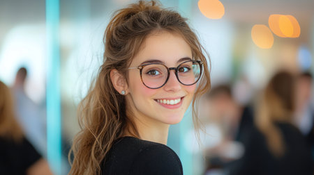 Smiling woman with glasses at networking event, exuding confidence and warmth.