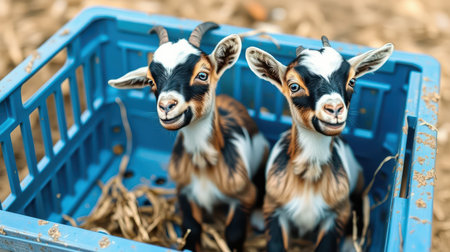 Two playful baby goats sit together in a blue basket filled with straw at a farm during daylight