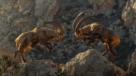 A powerful image of two male ibexes fighting in El Torcal, Antequera, their muscles tensed and horns locked against the rugged terrain.