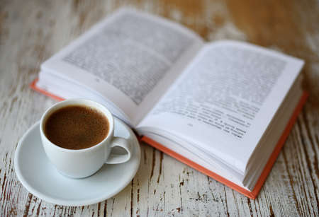 Still life with a cup of coffee and a book on table.