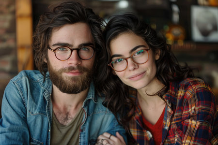 A young couple, both with dark curly hair and wearing glasses, look directly at the camera with smiles, the man's arm around the woman's shoulder.