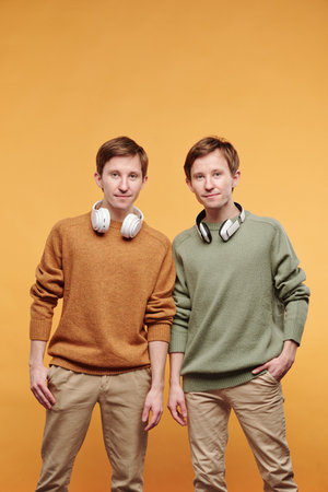 Portrait of smiling handsome young twins with wireless headphones around necks standing against bright background