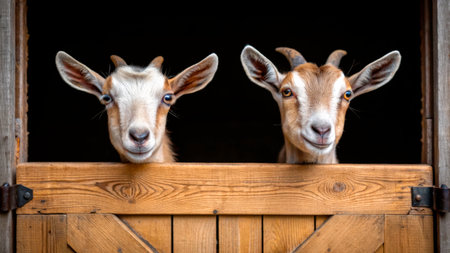 Two curious goats stand side by side, looking out from a rustic barn. The wooden structure adds charm as sunlight streams in, highlighting their playful expressions.