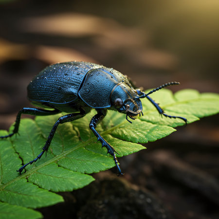 A captivating image of a beetle climbing on a dewy leaf at dawn, with soft sunlight illuminating the scene, capturing the tranquility of early morning nature.