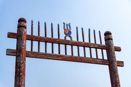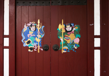 GIMHAE, SOUTH KOREA - JUNE 18, 2017 : Ancient traditional Korean style door of Royal tomb of king Suro of Gaya kingdom in Gimehae, South Gyeongsang province, South Korea.