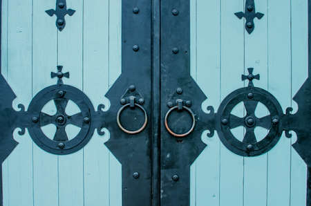 Metal door with rings door handles and metal rivets. Metal door of light blue color, medieval gates