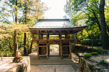 Architecture of an ancient buddhist monastery in Japan is seen. It is a sacred and pious place for all. On the background, lush green trees are seen. The design looks stunning.