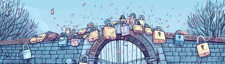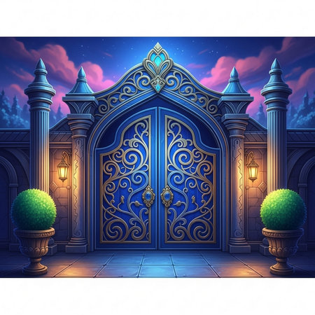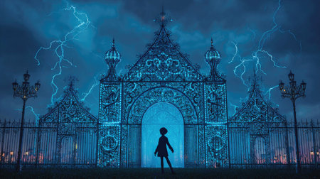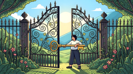 A person holds a large golden key to open ornate garden gates revealing a bright landscape.
