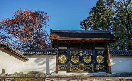 Kyoto, Japan - Nov 18, 2016. Wooden gate of Shinto Shrine in Kyoto, Japan. Kyoto served as Japan capital and the emperor residence from 794 until 1868.