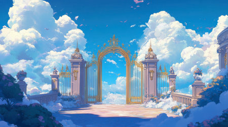 Door to Heaven. Arched passage open to heaven`s sky. Light at end of the tunnel. Hope metaphor.