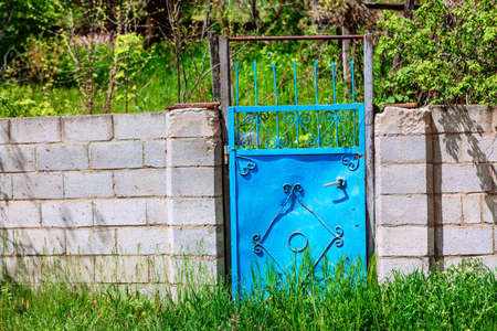 Typical Greek architecture details concept. Blue fence outdoor house during summer weather.