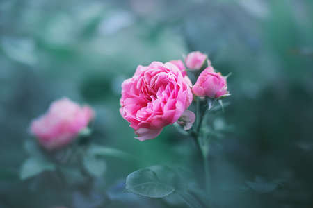 Beautiful pink roses bloom on a bush in the garden at dusk of summer. The beauty of nature and romance. Flora.